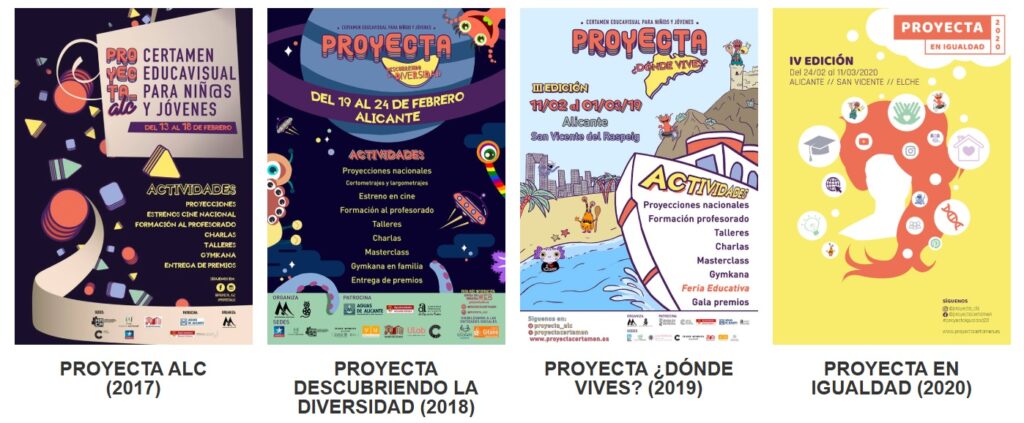 - Potenciar el conocimiento del audiovisual nacional tanto en el corto como en el largometraje y potenciar su presencia dentro del marco del festival y trabajar el fomento del juicio crítico. En el presupuesto se cerró un pago a las obras (era un pago simbólico, costaba mucho levantar el presupuesto, pero el mínimo era necesario e imprescindible). Acciones presenciales en centros educativos de Alicante y el último año en la provincia. Y proyecciones abiertas al público.